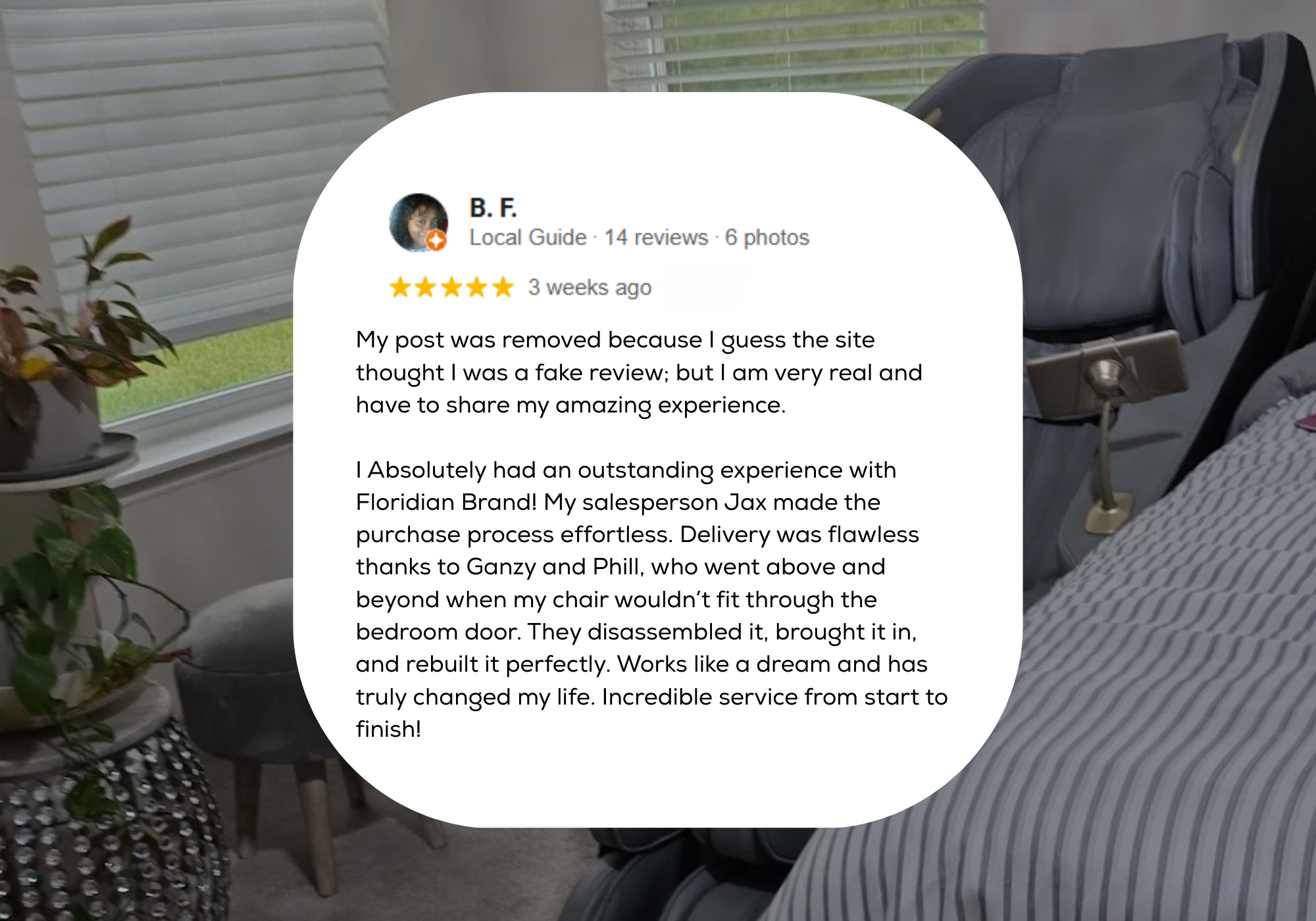 At Floridian Brand, delivery isn’t the end of the journey — it’s the beginning of your experience. Every chair is entrusted to our Factory Trained Teams, elite specialists who have mastered every component, every circuit, and every detail of the technology we build.